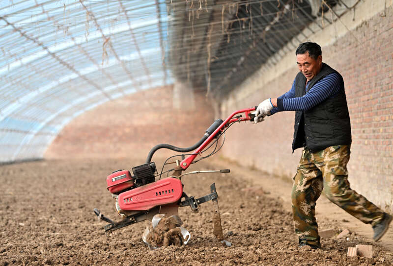 在天津市西青区辛口镇水高庄村,农户在修缮后的大棚内劳作(12月12日摄)。新华社记者 李然 摄