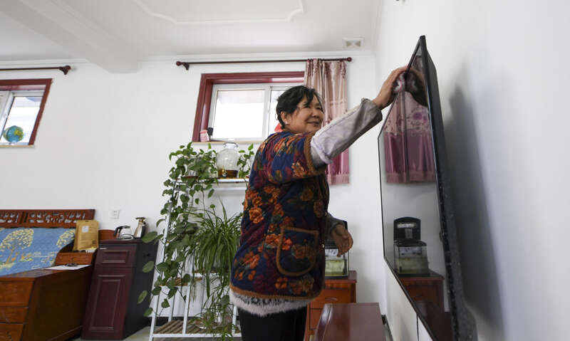 在北京市房山区佛子庄乡陈家台村,61岁的村民马书金在修缮后的房子内擦拭电视(12月12日摄)。新华社记者 鞠焕宗 摄