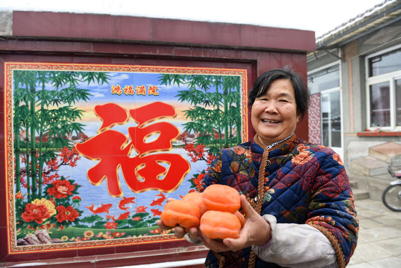 在北京市房山区佛子庄乡陈家台村,61岁的村民马书金在修缮完毕的院子里展示不久前在山上摘得的柿子(12月12日摄)。新华社记者 鞠焕宗 摄