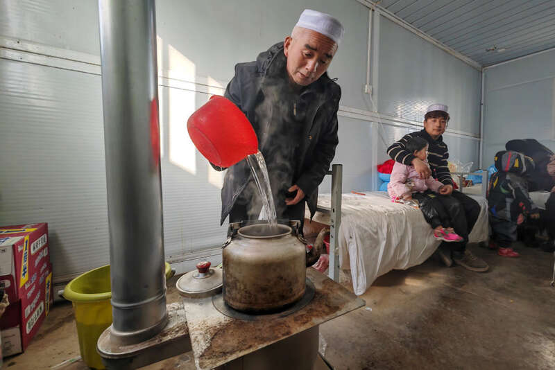在甘肃临夏积石山县大河家镇梅坡村活动板房安置点,受灾村民在活动板房内的火炉上烧水(12月21日摄)。新华社记者 范培珅 摄
