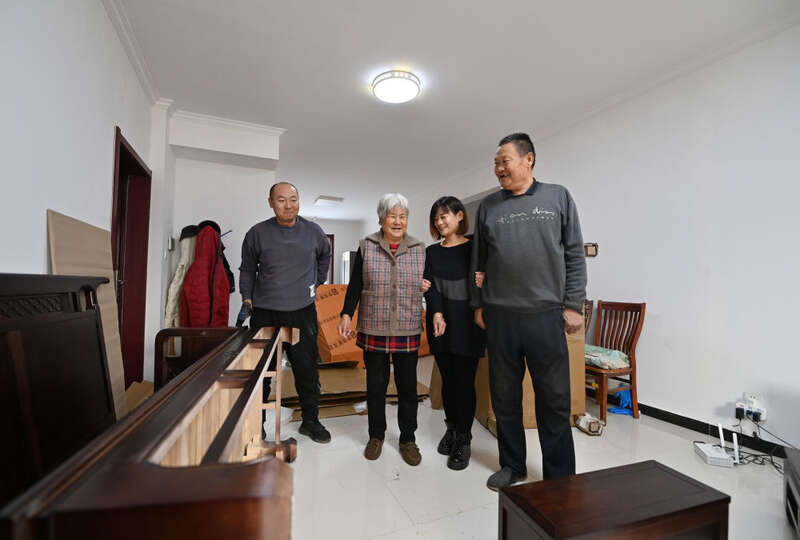 天津市西青区辛口镇水高庄村村民王恩龙(右一)与家人搬入新家(12月12日摄)。新华社记者 李然 摄