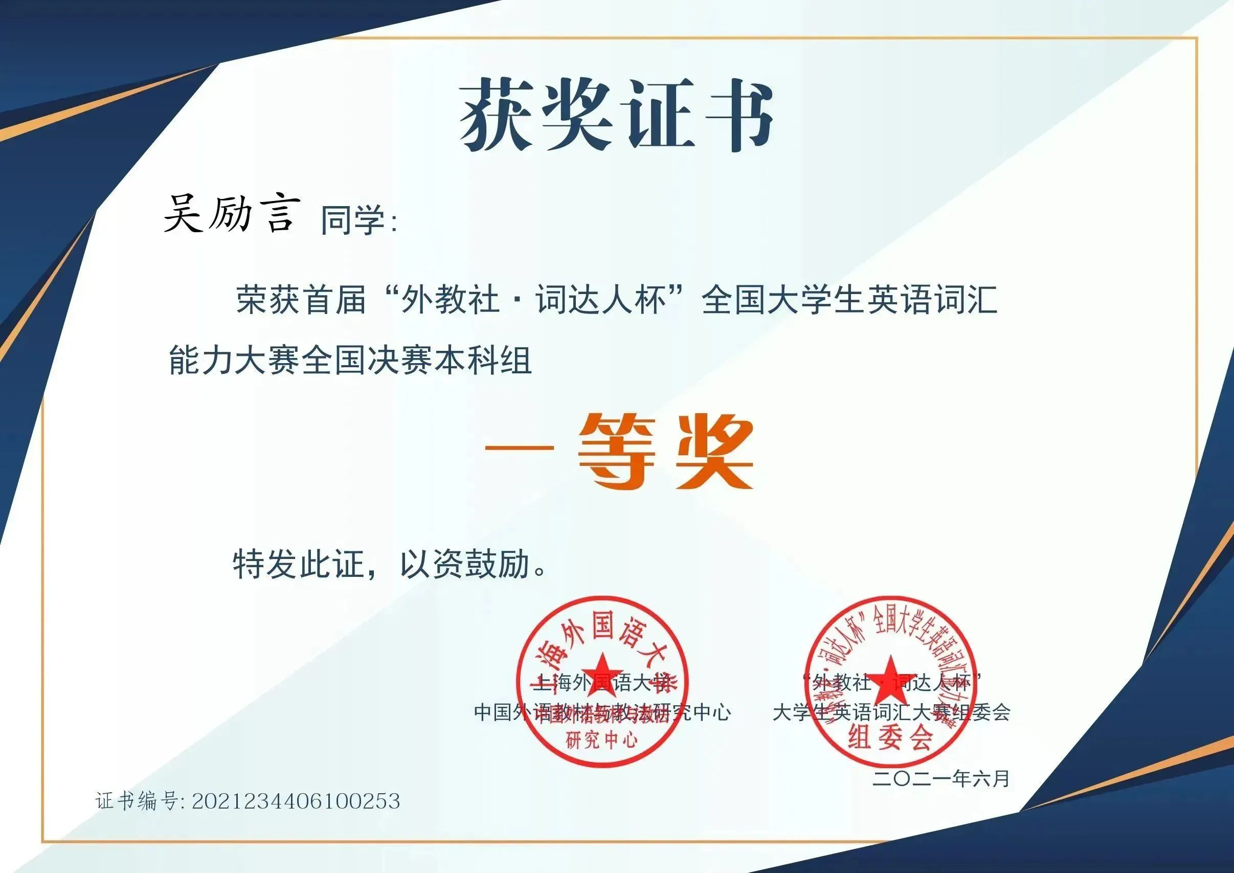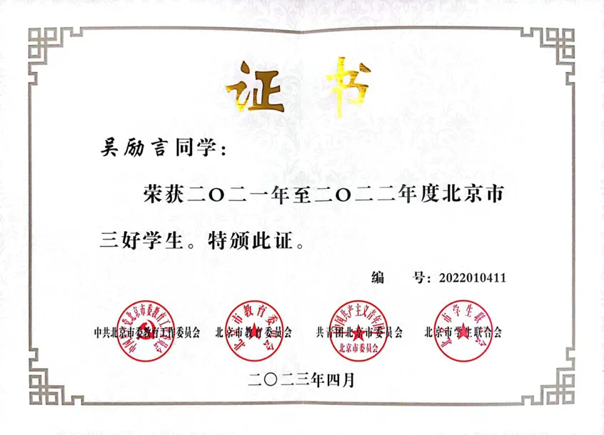 “作为公共管理专业的学生,要抓住参加比赛的机会了解跨学科的思维方法,更好地理解‘公共’之内涵。”吴励言曾参加各类学术科研、创新创业类竞赛,获得了“正大杯”全国大学生市场调查分析大赛北京市一等奖、外教社“词达人”杯大学生英语词汇能力竞赛全国一等奖、“学创杯”创业模拟大赛省级二等奖等奖项,并参与了清华大学全球可持续发展目标公共政策案例分析大赛。回望过去的竞赛经历,吴励言认为“最宝贵的并非是奖项本身,而是在分析与解决问题中开阔了视野、增益了智识”。