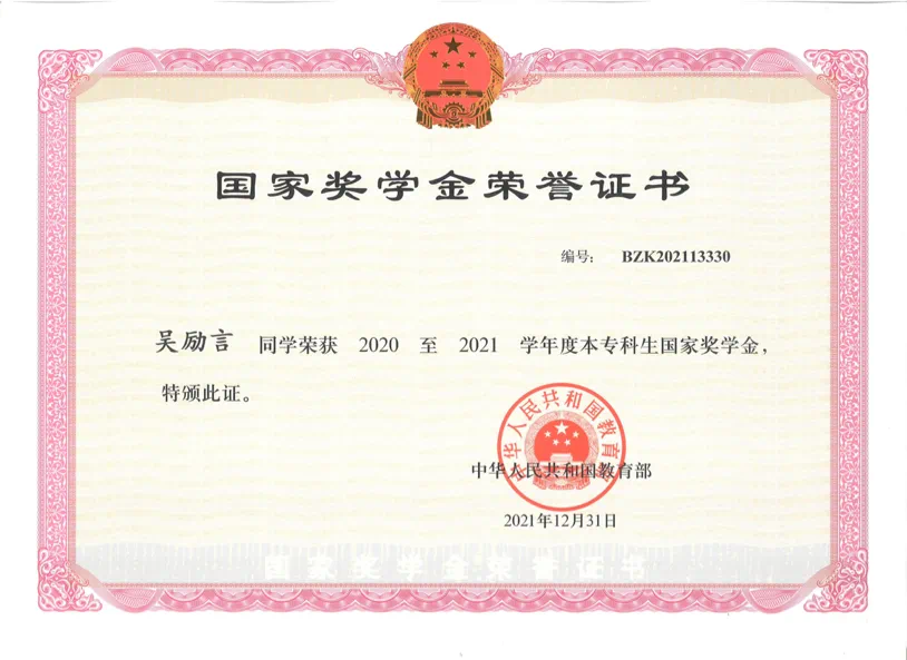 绩点4.43/5.00,学业成绩和综合测评成绩专业第一,连续三年获国家奖学金、专业一等奖学金。曾获北京市三好学生、专业一等奖学金、优秀共青团员及优秀学生干部等奖励及荣誉称号,累计获得国家级奖项2项、省部级9项、校级奖项10余项,目前已保研至北京大学法学院。