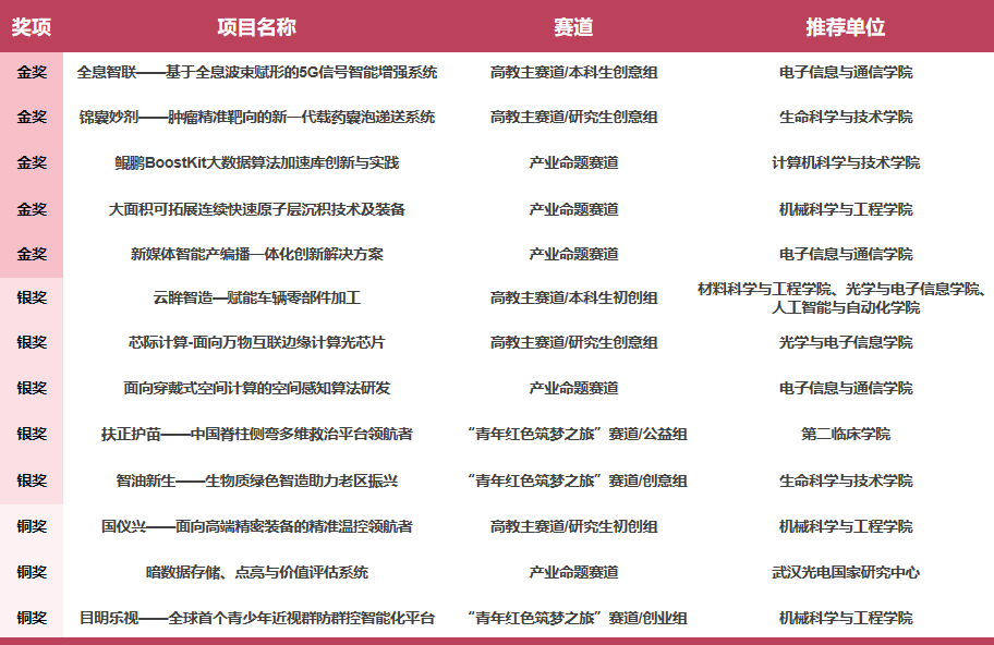 在产业命题赛道,我校计算机学院“鲲鹏BoostKit大数据算法加速库创新与实践”项目、机械学院“大面积可拓展连续快速原子层沉积技术及装备”项目、电信学院“新媒体智能产编播一体化创新解决方案”项目获金奖。电信学院“面向穿戴式空间计算的空间感知算法研发”项目获银奖。武汉光电国家研究中心“暗数据存储、点亮与价值评估系统”项目获铜奖。