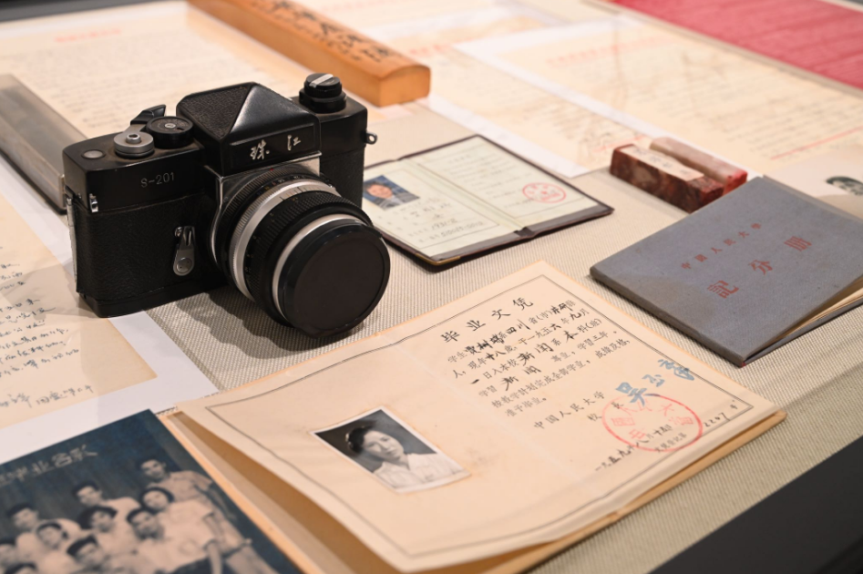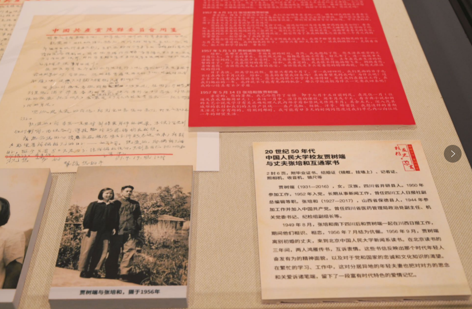 展出的书信里也有感人的儿女情长。校友贾树端与张培和的互通家书是生动例证。1949年8月,张培和与贾树端一起在《川西日报》工作,期间他们相识、相恋,并于1956年7月结为伉俪。同年9月,贾树端离别初婚的丈夫,来到人大新闻系读书。在北京读书的三年间,在繁忙的学习、工作中,这对分居异地的年轻夫妻也把对对方的思念和关爱诉诸笔端,留下了一段富有时代特色的爱情记忆。“这些书信反映出那个时代年轻人奋发有为的精神面貌,展现了他们对党和国家的忠诚以及对文化知识的渴望。”展览负责人说。