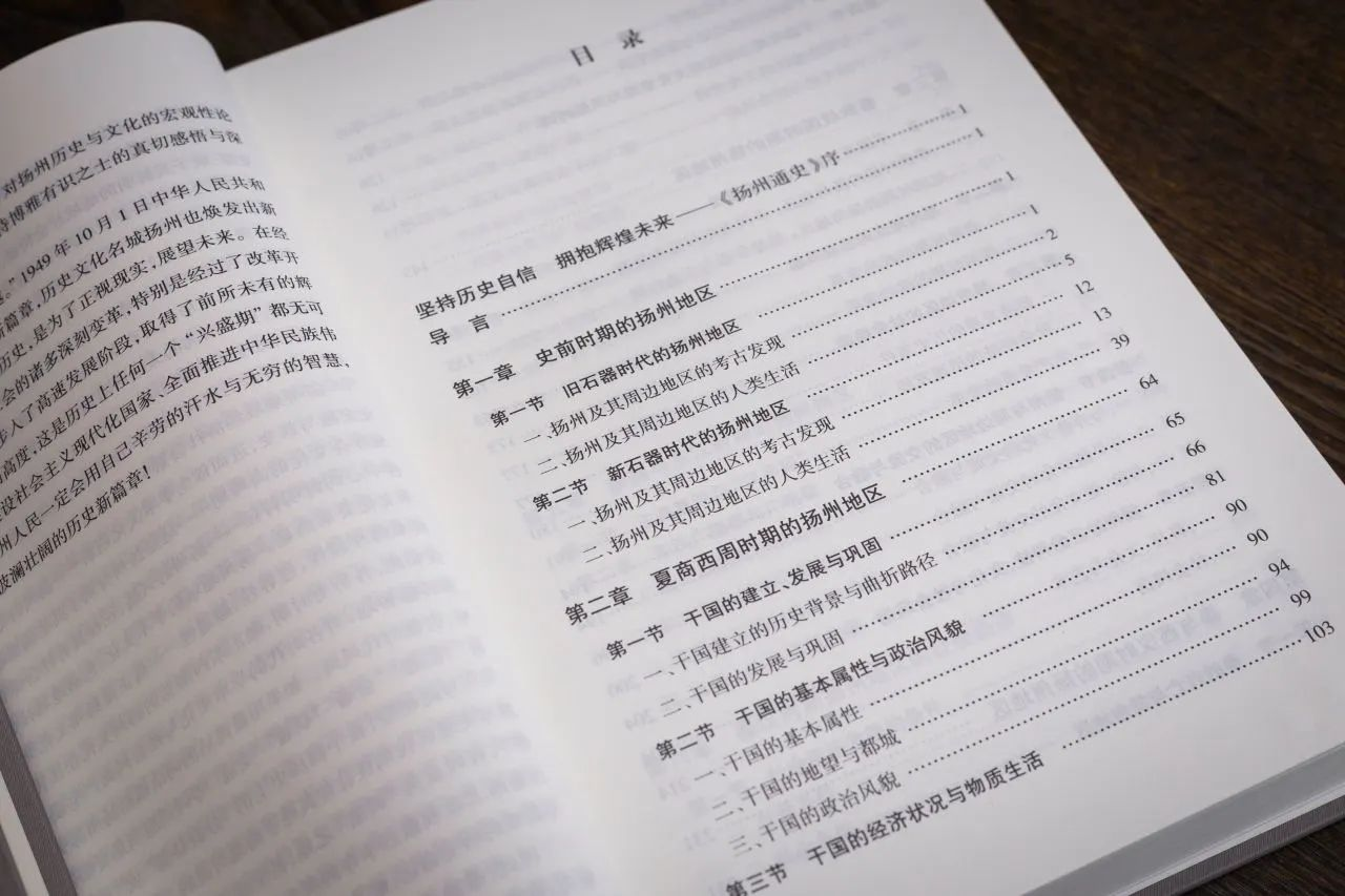 据了解,《扬州通史》是第一部系统研究扬州城市历史的严谨规范的学术著作,全书以扬州现辖行政区为地理范围,根据扬州历史特点,分为先秦秦汉魏晋南北朝、隋唐五代、两宋、元明、清代、中华民国等六卷八册,总计近400万字。从新石器时代高邮龙虬庄遗址,春秋时期吴筑邗城,到西汉吴王刘濞经营盐铁,隋朝贯通大运河,唐时“扬一益二”,清代盐业漕运鼎盛,及至近代转型发展,全方位展现了扬州历代地理变迁、政治演进、建置沿革、城池兴废、军事斗争、经济发展、社会文化等面貌,总结了扬州在各个历史时期的主要特点,并探求历代治乱兴衰的原因所在,对于保存城市记忆,延续名城文脉,彰显家国情怀,增强文化自信具有重要的意义。