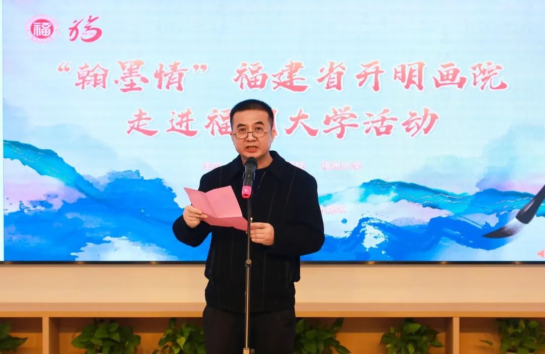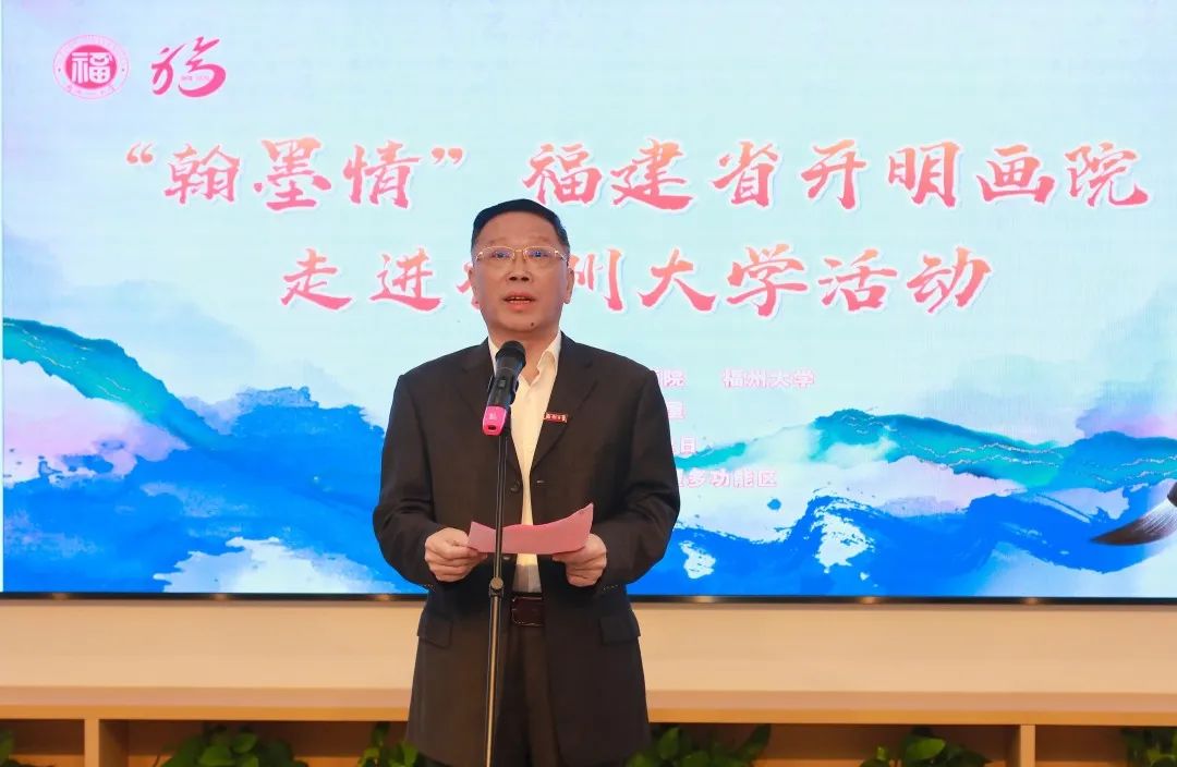 校党委书记陈国龙 为活动致开幕词。他在致辞中代表学校对民进省委、福建省开明画院为福州大学发展建设给予的大力支持表示衷心感谢,向莅临活动的各位领导和来宾表示热烈欢迎。他表示,中国书画是中华民族最具有代表性的文化象征之一,展现了中华传统文化的精髓,是中华文化的重要传承者和弘扬者。此次福建省开明画院捐赠的作品对丰富校园文化具有重要的推动作用,福州大学将以此次活动为契机,积极发挥高校弘扬中华优秀传统文化的社会功能,引导广大师生在践行“两个结合”中坚定文化自信自强;希望双方进一步强化交流合作,开展更多的艺术交流和教育活动。