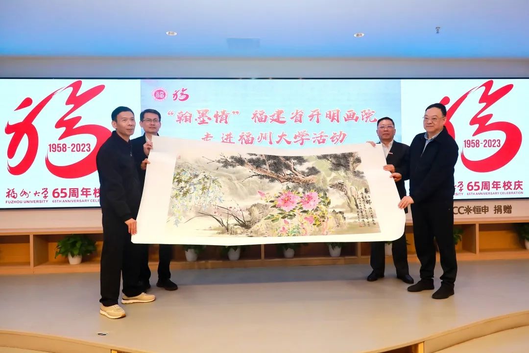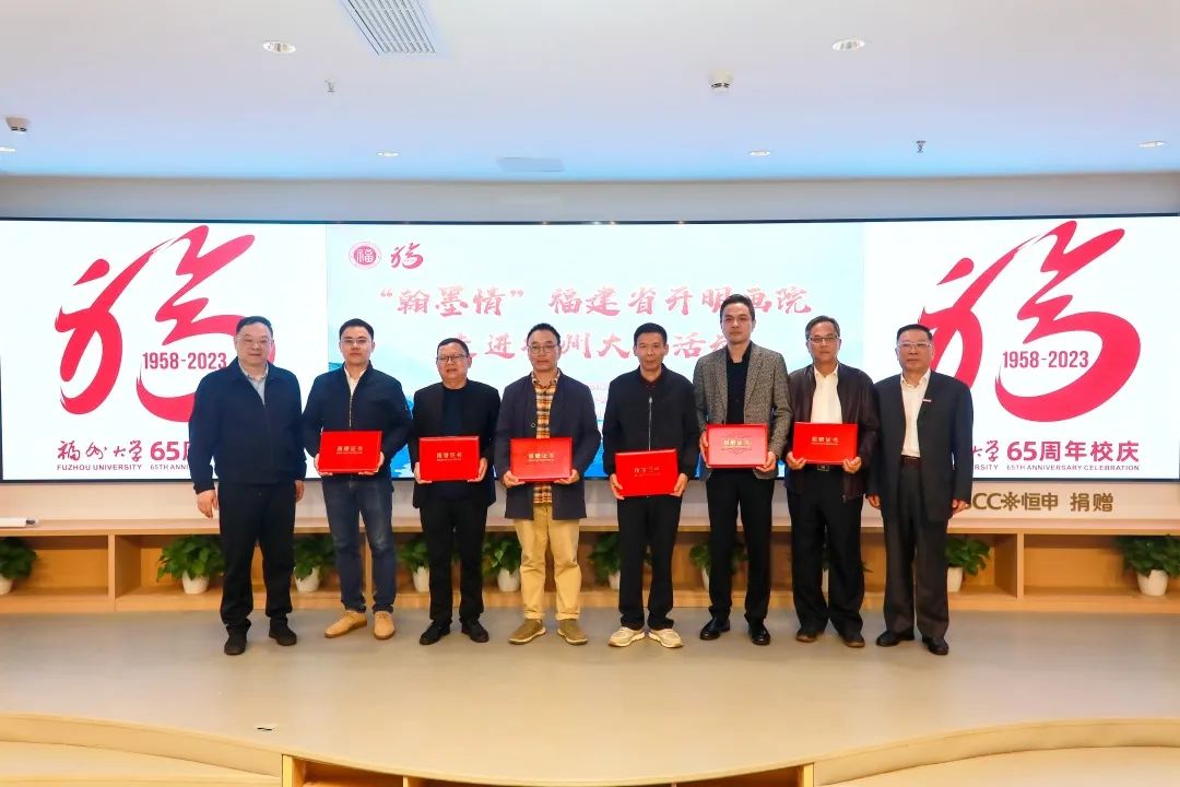 仪式上, 沈斗平院长、邓春晖副院长 代表福建省开明画院向福州大学 捐赠了书画作品15幅 ,校党委陈国龙书记、黄身勇副书记代表学校接受捐赠;民进中央常委、福建省委会主委、福建省政协严可仕副主席、校党委陈国龙书记共同为开明画院书画家颁发了捐赠证书。