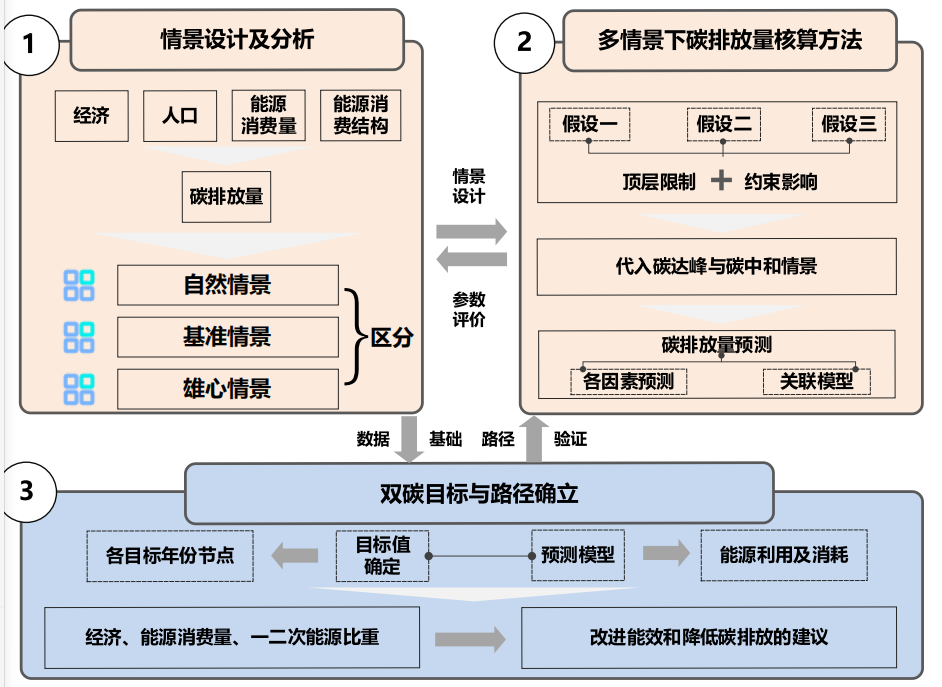 他们把碳排放量、人口变化量、GDP和能源消耗量直接的变化关系,列写线性微分方程组,再通过龙格库塔法进行迭代求解数值解,建立了一个基于人口和经济变化的能源消费量预测模型,可以预测出四个指标未来的数值。同时,他们设定了未来可能出现的三种情景模式:无人为干预的自然情景、按时碳达峰与碳中和的基准情景、率先碳达峰与碳中和的雄心情景。然后通过模型定量分析三种情景的不同预测结果,在此基础上提出规划建议,为解决区域碳排放问题提供实用的、准确的方案。