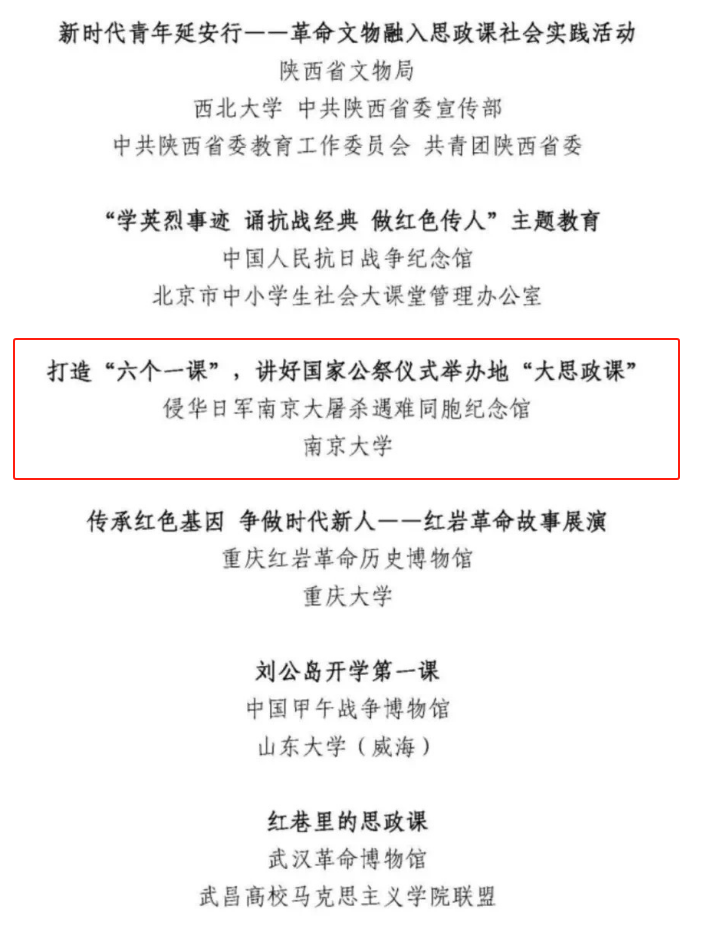 近日,南京大学与侵华日军南京大屠杀遇难同胞纪念馆共建的“打造‘六个一课’ ,讲好国家公祭仪式举办地‘大思政课’”项目入选国家文物局、教育部公布的以革命文物为主题的“大思政课”优质资源示范项目名单,全国仅10个项目入选。