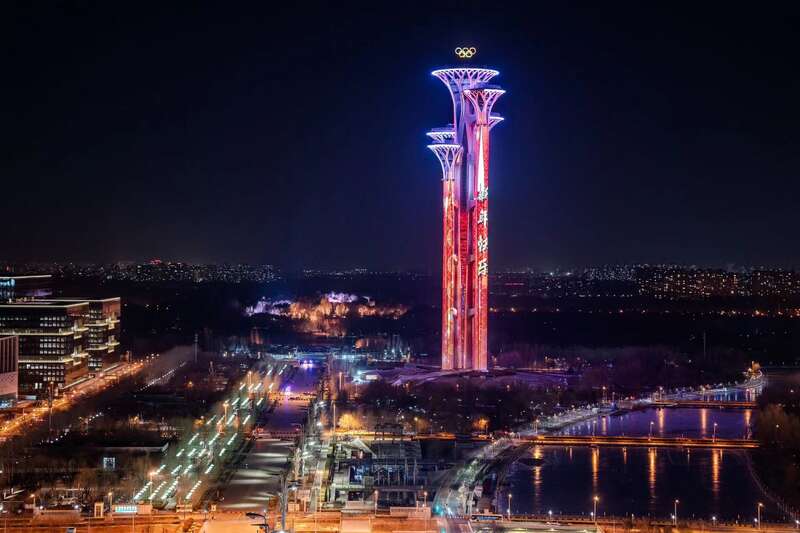 北京朝阳2024新年灯光秀上演,奥林匹克塔等地标性建筑在夜空中大放异彩。图片来源:北京朝阳区融媒体中心