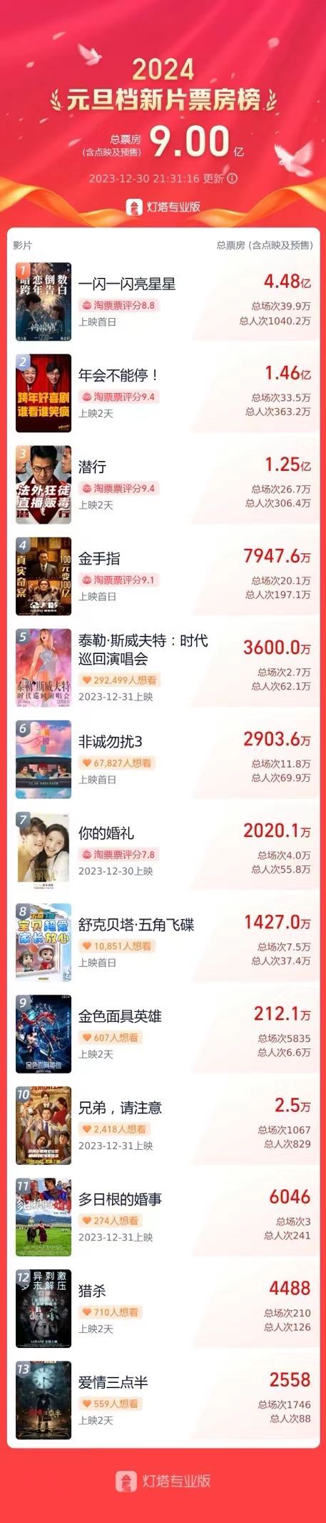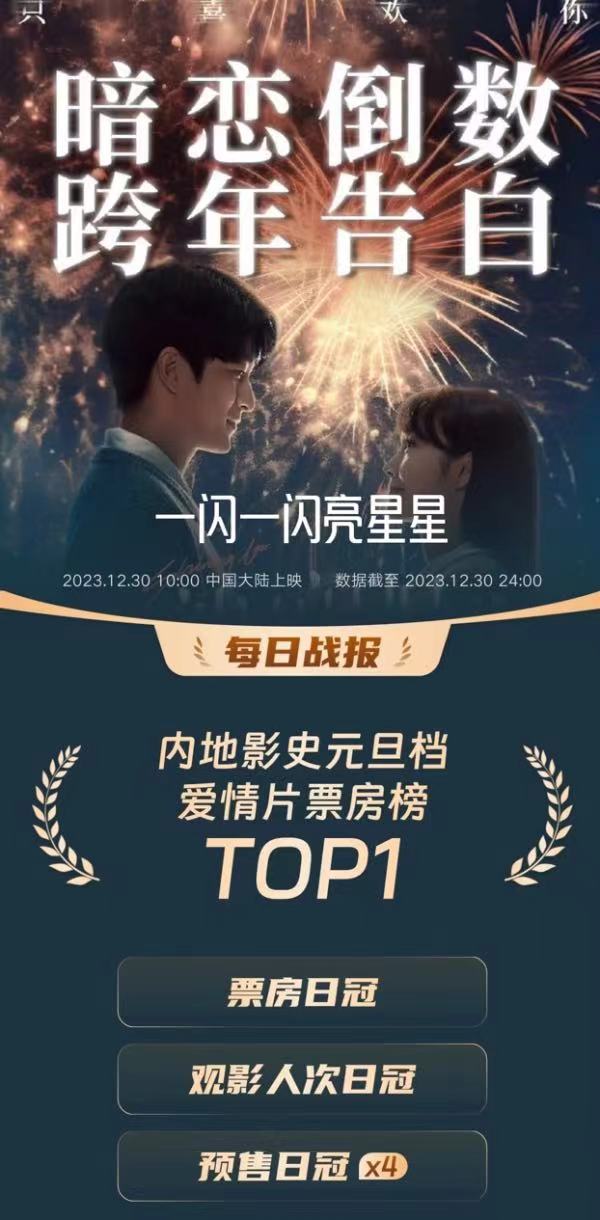 在新片扎堆,老片依然能打的跨年档,《一闪一闪亮星星》上映首日,不仅以超过30%的绝对优势排片“霸屏”影院,22.8%的平均上座率也是同档期新上映的影片中最高的。