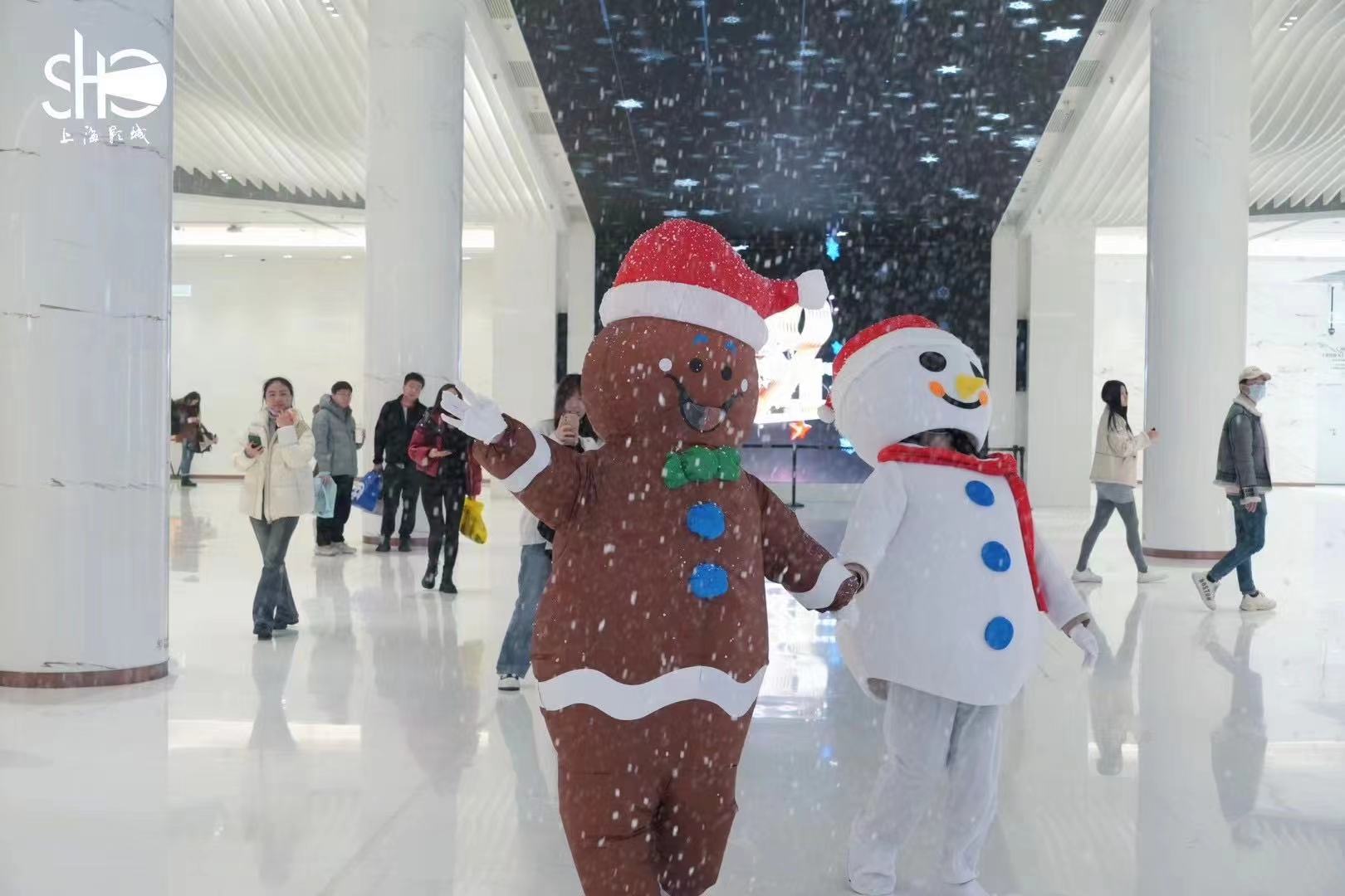 在网络上好评度颇高的上海影城SHO2号厅下雪场,动用了两台造雪机,营造了从影院顶部均匀落雪的效果,同时影院方配合下雪的浪漫氛围,额外配置了4台泡泡机。场外的天幕加人偶给前来打卡的观众更多的拍照留念场景,仪式感拉满。