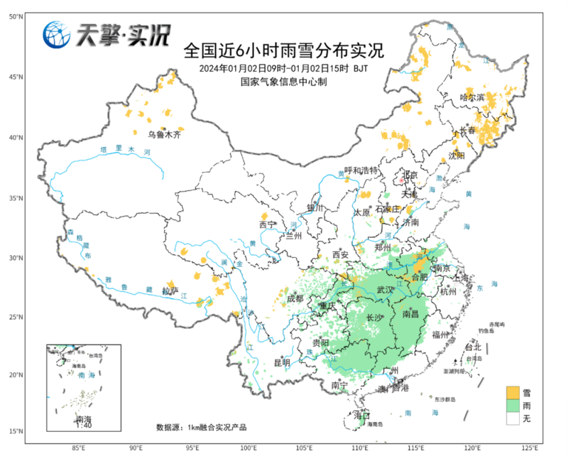 2日白天,南方降雨区域呈现出西南-东北走向,并不断东移。15时前后,伴随着降温,安徽和江苏部分站点还出现了降雪或雨夹雪。