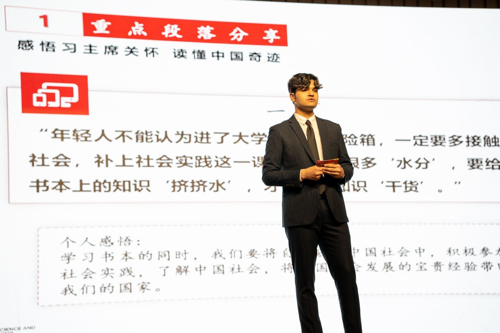 “书里有很多‘水分’,只有和群众实践结合,才能把‘水分’挤掉,要给书本上的知识‘挤挤水’,才能得到知识‘干货’。”第一次站在台上,21岁的初盼略显紧张,但他坦言,对自己来说,这已是勇敢迈出的一步。