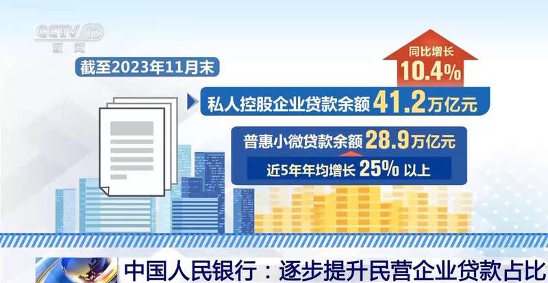 在信贷政策方面,开展中小微企业金融服务能力提升工程,完善金融服务体系,增强民营贷款的稳定性。截至2023年11月末,私人控股企业贷款余额41.2万亿元,同比增长10.4%;普惠小微贷款余额28.9万亿元,近5年年均增长25%以上。