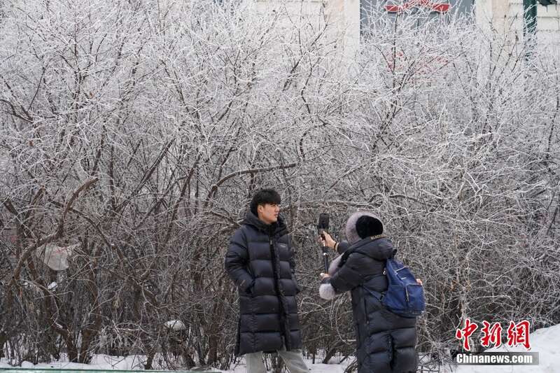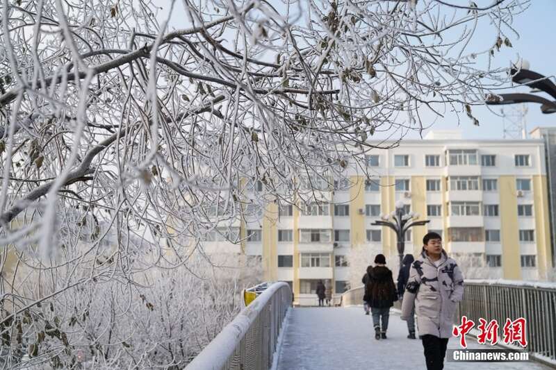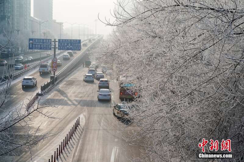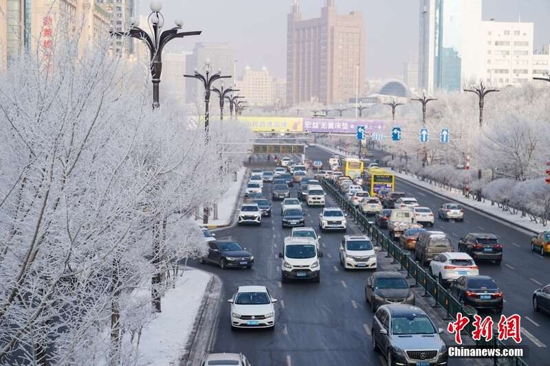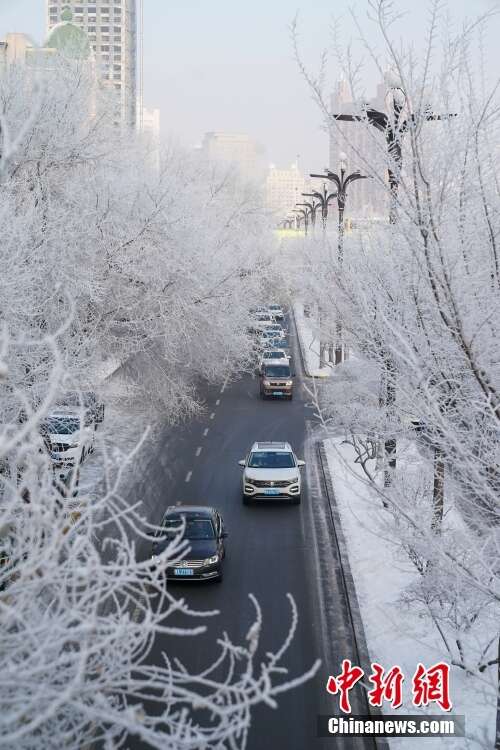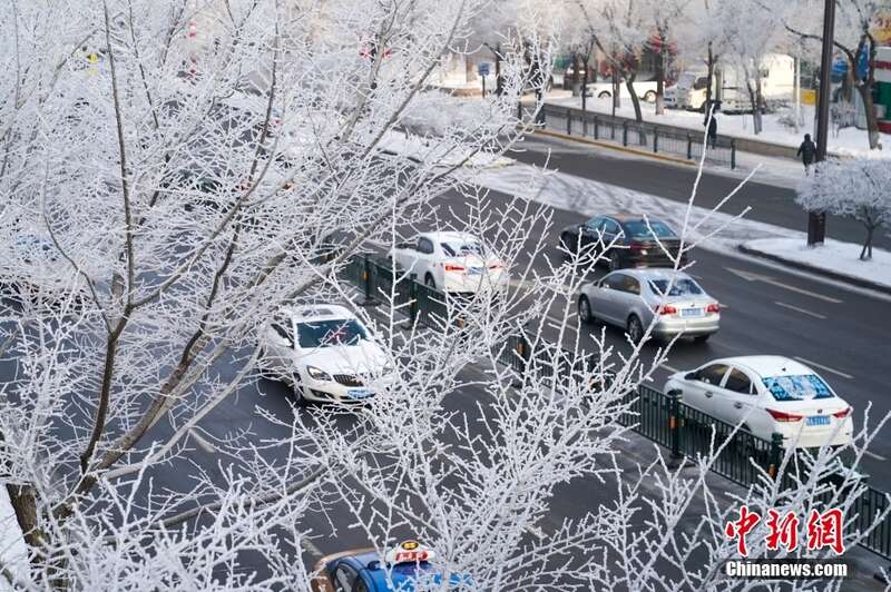 1月3日,黑龙江哈尔滨大街小巷出现雾凇景观。
