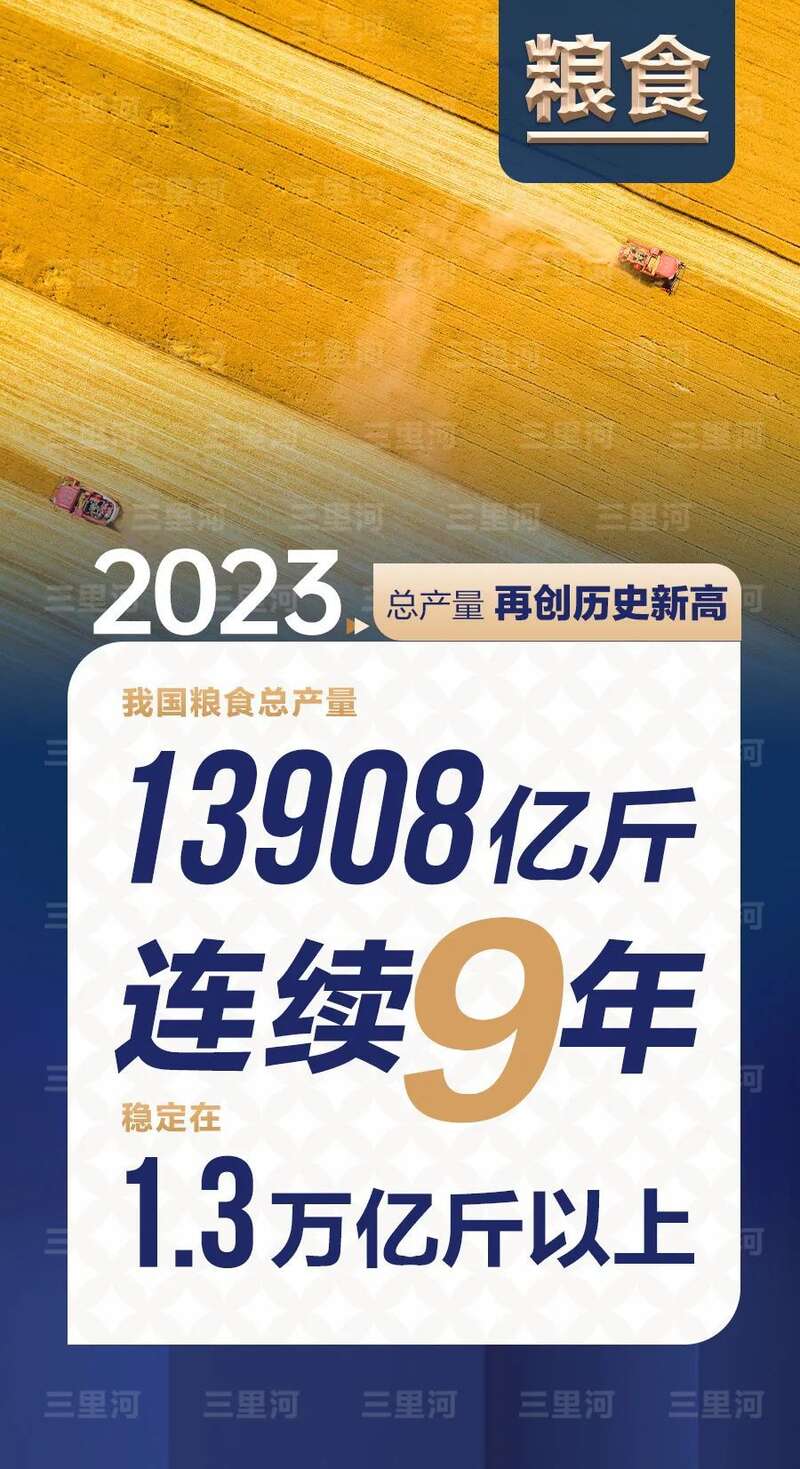 2023年,中国粮食产量再创历史新高,连续9年稳定在1.3万亿斤以上。