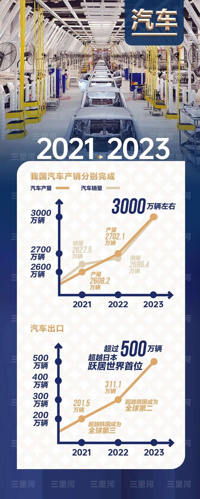 2023年,全年汽车产销量预计达3000万辆左右、创历史新高,出口超过500万辆,超越日本,跃居世界首位。