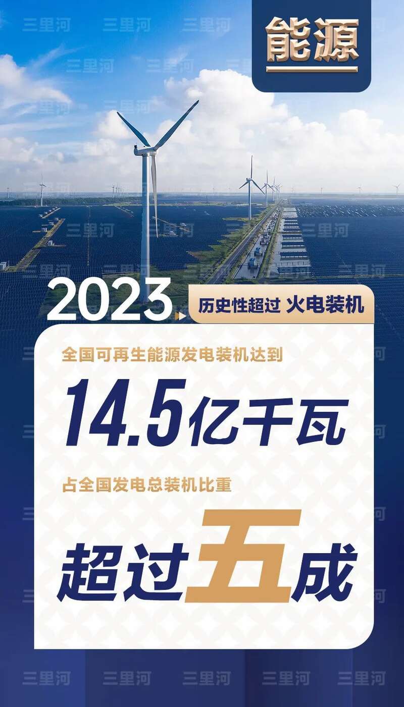 2023年,全国可再生能源发电装机达到14.5亿千瓦,占全国发电总装机比重超过五成,历史性超过火电装机。