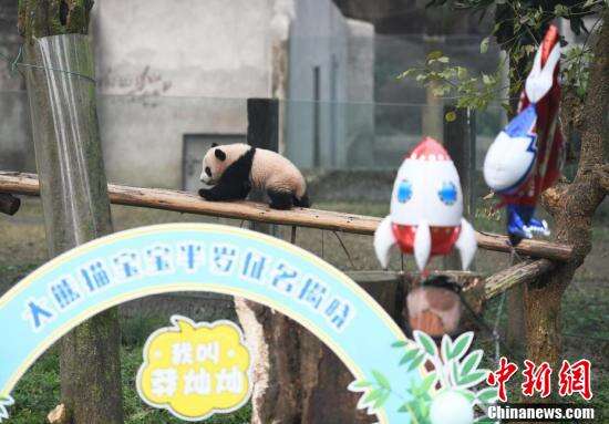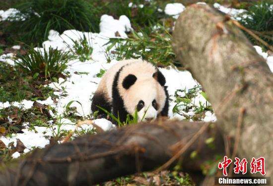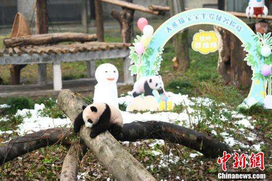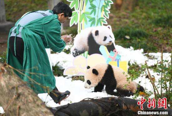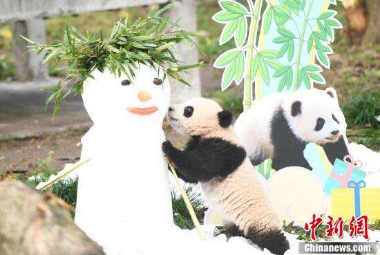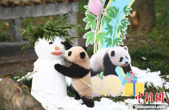 据悉,2023年7月6日,大熊猫“莽仔”产下一只雄性大熊猫幼崽,10月,重庆动物园启动了大熊猫幼崽征名活动,经多轮筛选、网络投票及综合审议,最终确定“莽仔”幼崽的名字为“莽灿灿”。图为大熊猫“莽灿灿”与雪人玩耍。