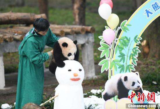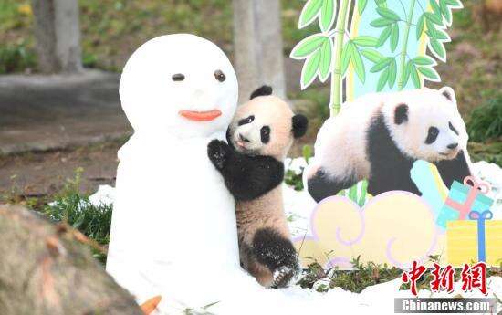 1月6日,重庆动物园一只半岁大熊猫正式命名为“莽灿灿”,同时与游客见面,萌态十足。图为半岁大熊猫“莽灿灿”与雪人玩耍。