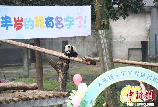 饲养员抱出半岁大熊猫“莽灿灿”与游客见面。