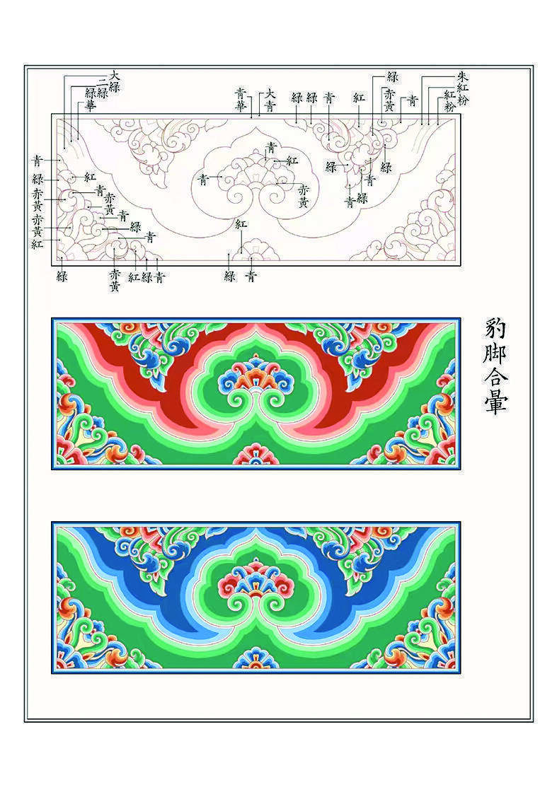 故宫彩画大家王仲杰多年来悉心指导笔者的研究,强调《营造法式》彩画的破译,应在“找感觉”上多下工夫,从更广阔的视角,深入体悟宋代装饰艺术的“精神”。南齐谢赫的“六法”(气韵生动、骨法用笔、应物象形、随类赋彩、经营位置、传移摹写),也适于彩画的研习。北宋官式彩画线条婉丽、设色古雅。线条追求轻重、徐疾的变化,翩若惊鸿,婉若游龙。色彩配置既有规律可循,又灵活随宜。设色亦非平涂,而富于微妙的变化。《营造法式》彩画图样的复原不可急于求成,须循序渐进、持续修正。