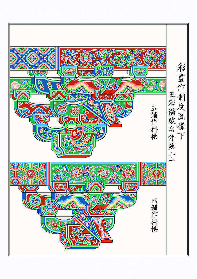 《营造法式》“彩画作制度”将彩画概括为五种类型:其一,五彩遍装,为冷暖相间、纹饰华丽的上等彩画;其二,碾玉装,冷色调上等彩画;其三,青绿叠晕棱间装,冷色调中等彩画;其四,解绿装,暖色调中等彩画;其五,丹粉刷饰,暖色调下等彩画。此外,还有按一定比例组合不同类型的“杂间装”。
