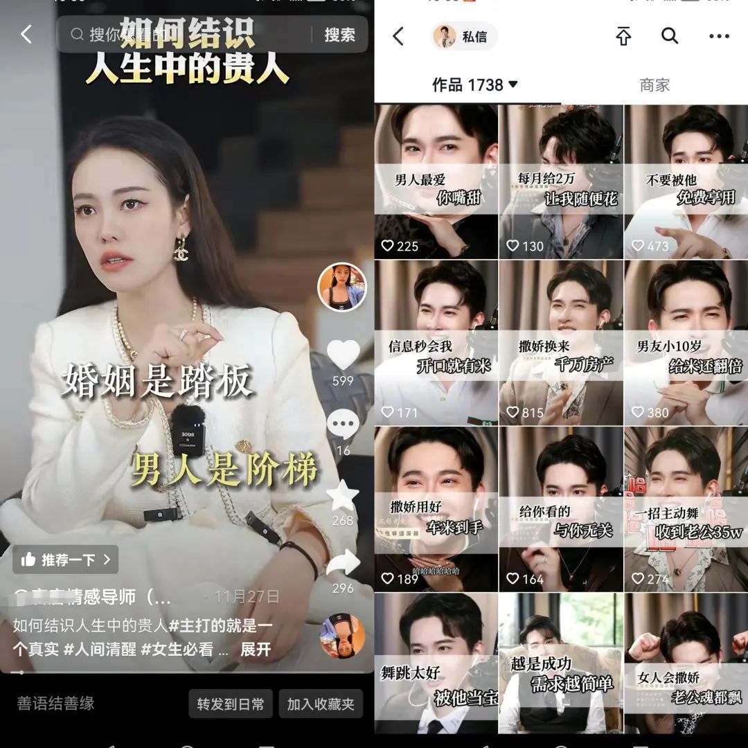 近日,媒体曝光了部分自媒体账号借情感咨询名头,通过直播连麦、授课短视频等形式输出不良恋爱观,教女性找“金主”、拿捏男人的直播间“情感生意”。
