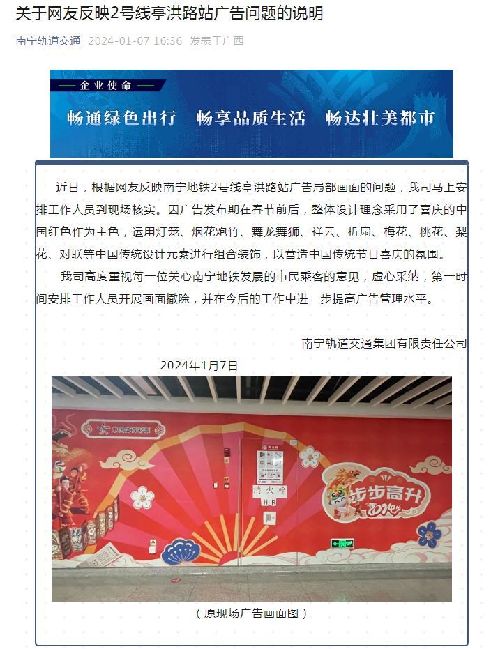 近日,根据网友反映南宁地铁2号线亭洪路站广告局部画面的问题,南宁轨道交通集团有限公司马上安排工作人员到现场核实。因广告发布期在春节前后,整体设计理念采用了喜庆的中国红色作为主色,运用灯笼、烟花炮竹、舞龙舞狮、祥云、折扇、梅花、桃花、梨花、对联等中国传统设计元素进行组合装饰,以营造中国传统节日喜庆的氛围。