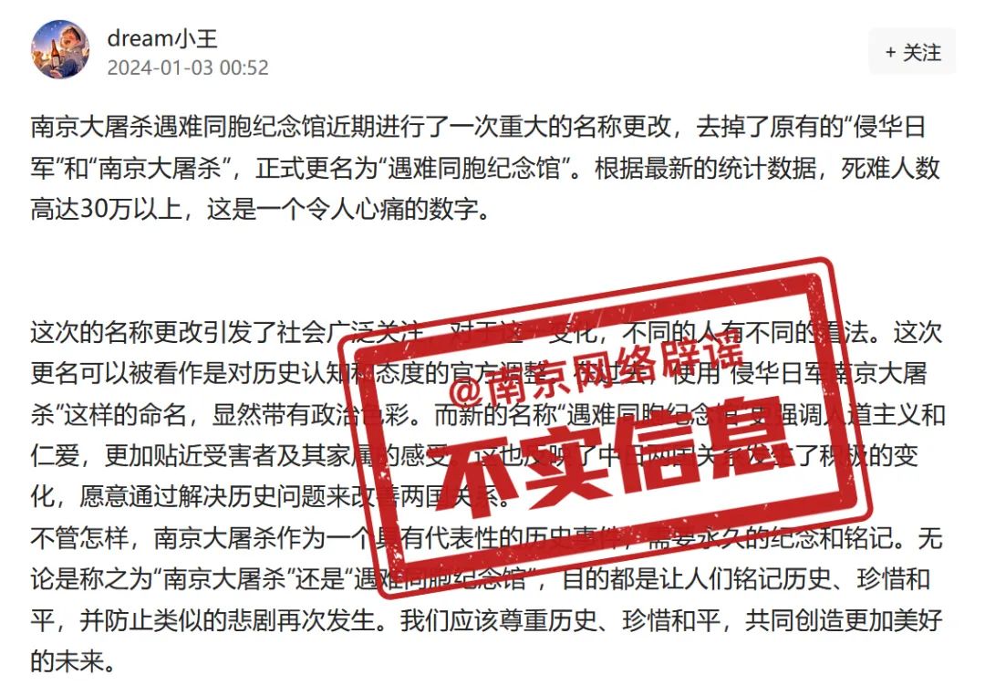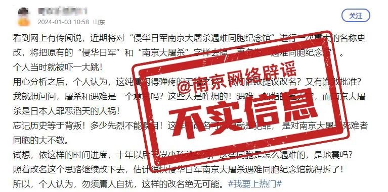 近日,网络上有消息传言“ 侵华日军南京大屠杀遇难同胞纪念馆更名为遇难同胞纪念馆”,引发一些网民朋友的关注和讨论。