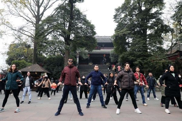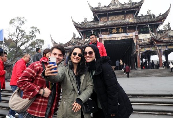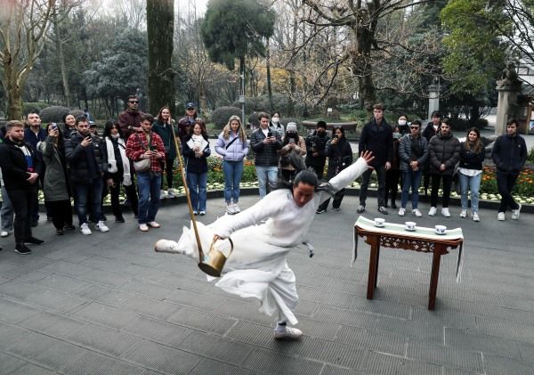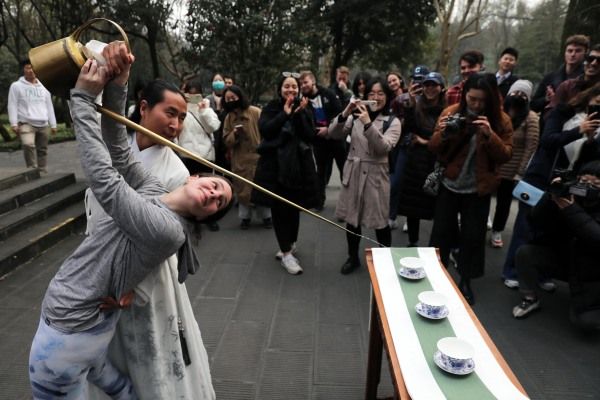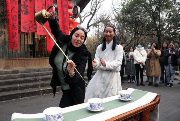 2024年1月8日,四川省都江堰市,一位美国哥伦比亚大学学生体验传统茶技。当日,由29名美国哥伦比亚大学青年学生组成的代表团参访都江堰水利工程,体验传统茶技和青城太极。 中新社记者 王磊 摄