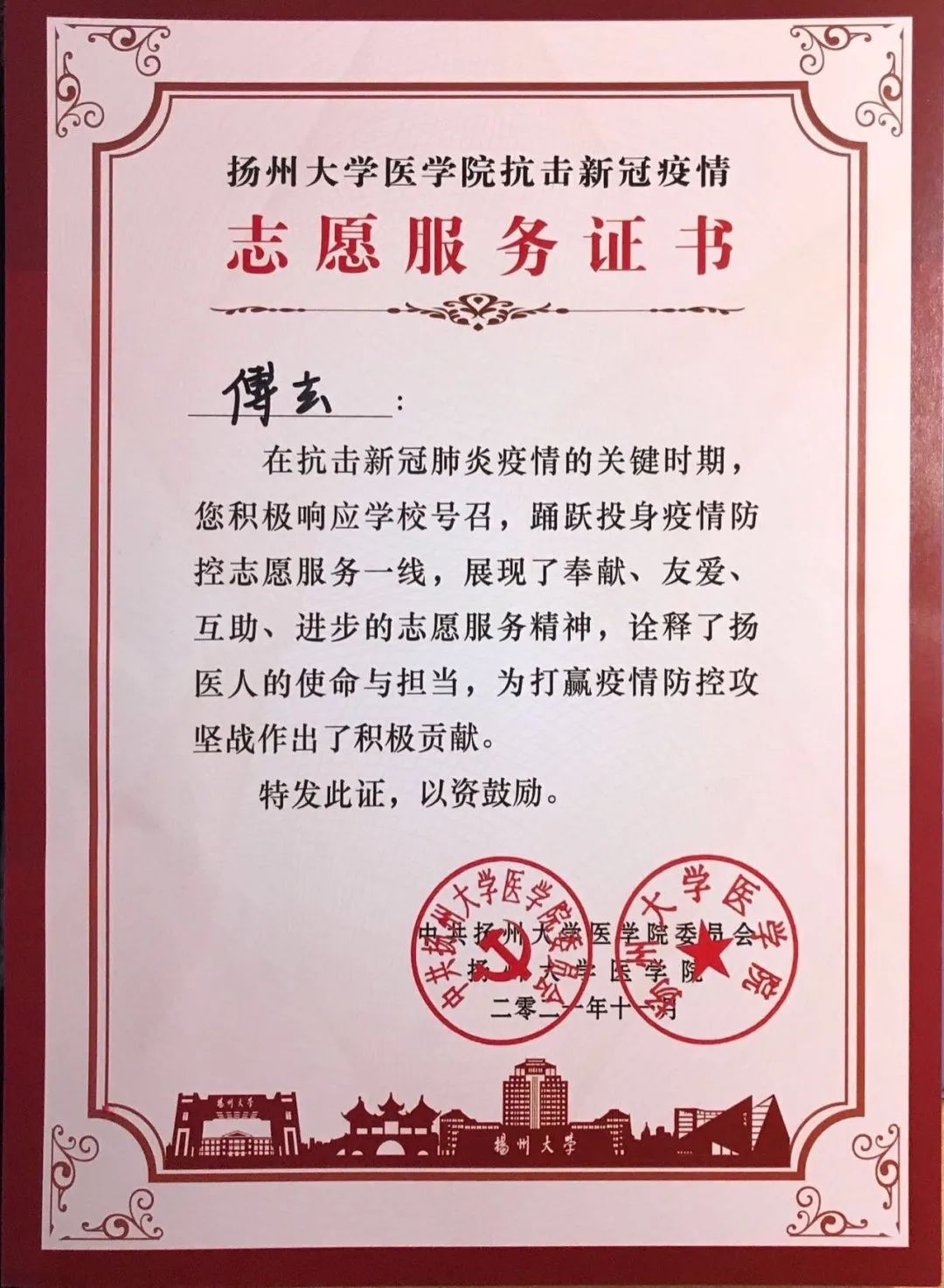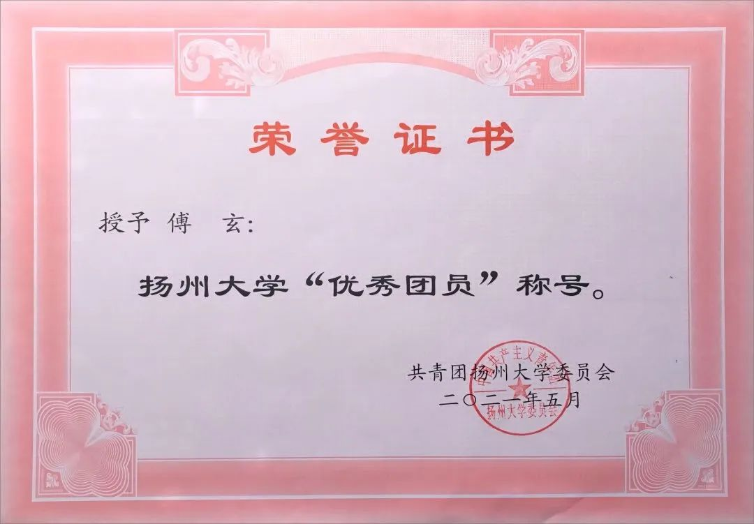 博学而后成医,厚德而后为医。作为一名医学生,傅玄在钻研学术的同时,也在修炼一颗大爱无疆的医者之心。新冠肺炎疫情期间,他作为志愿者在扬州邗江区进行核酸采样。尽管每日裹在厚重的防护服中进行长时间高强度的工作,但傅玄并不觉得辛苦与枯燥。在他看来,厚德是每个医生都必须具备的心性。“这段经历是我人生道路中的宝贵财富之一,也让我在医学道路上走得更加坚定从容。正如医学院院训所言——厚德惠生,博极医源。”