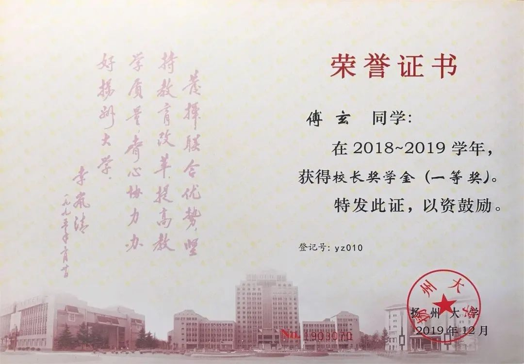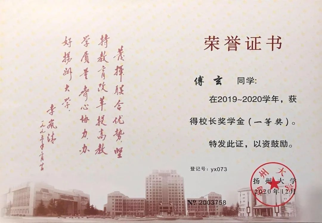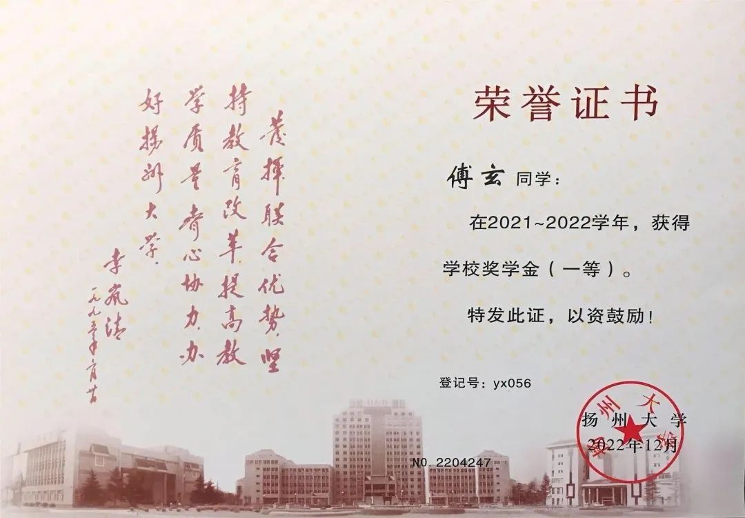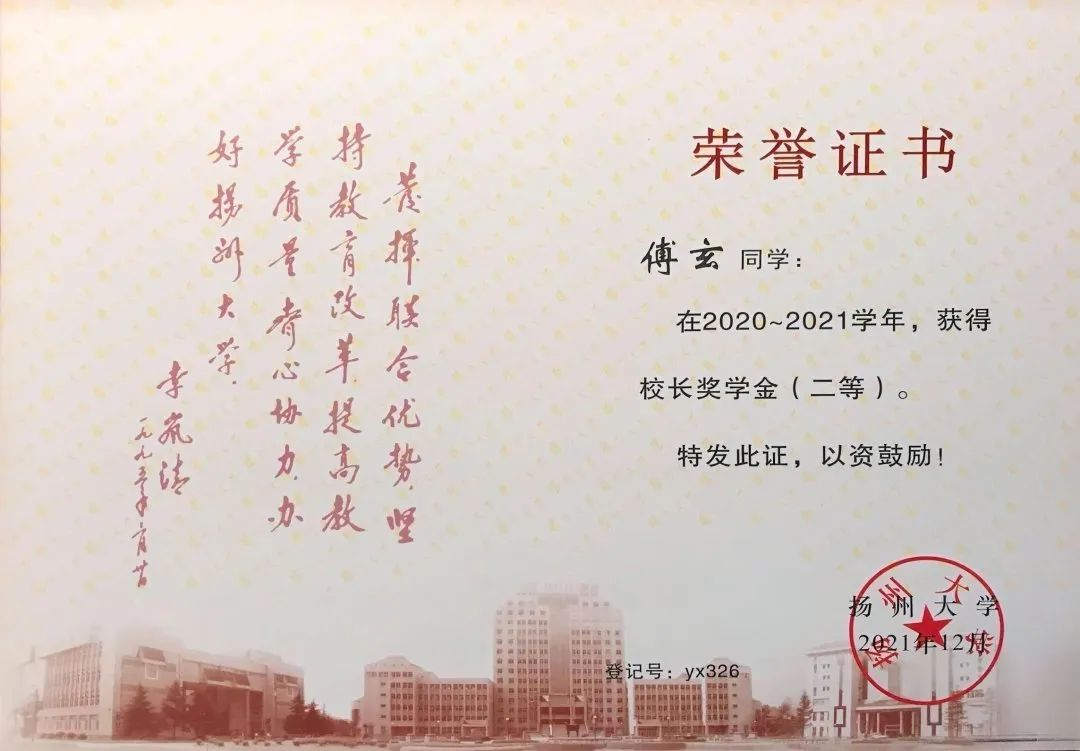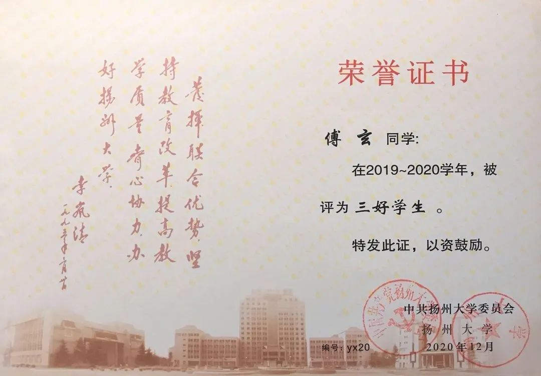 从零开始学习临床医学,对傅玄来说是一项巨大的挑战。他迷茫过、退缩过,但是凭着一腔热血坚持了下来。“兴趣使然,感其崇高。”当被问及“一腔热血”的内涵时,傅玄激动地回答道。“兴趣使然”,他对于现代医学领域里尚未解决的难题,愿竭心尽力去探究;“感其崇高”,他愿坚守医学之初心,“除人类之病痛,助健康之完美”。在他的孜孜以求下,傅玄荣获学校奖学金(一等)3次、学校奖学金(二等)1次、朱敬文奖学金1次、校“三好学生”、校“优秀团员”等荣誉。