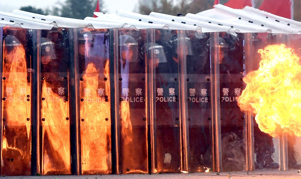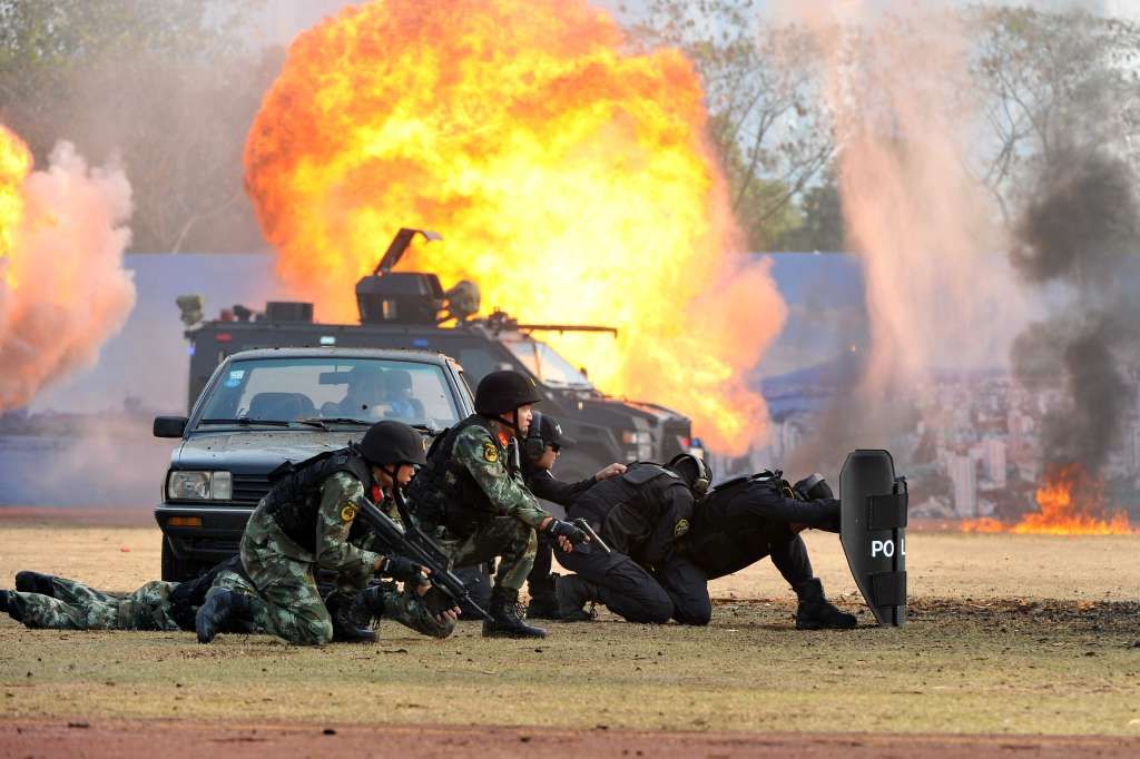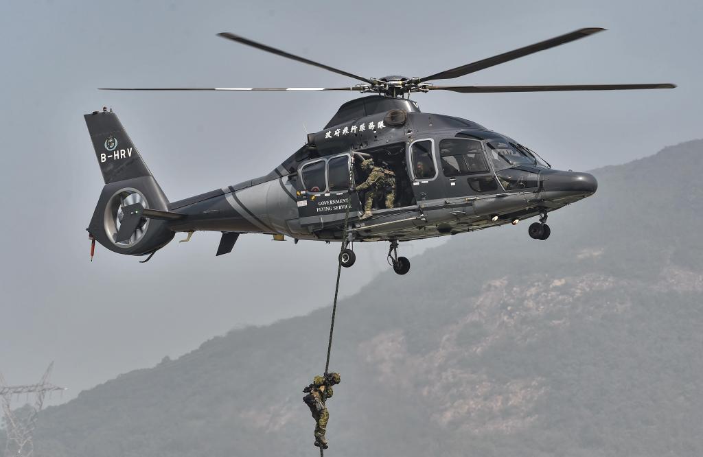 2019年1月12日,“香港警队175周年大汇演暨警民同乐日“于黄竹坑香港警察学院举行,多个警队菁英部门,包括要员保护组、反恐特勤队及飞虎队等在汇演的联合反恐演习中亮相。演习模拟四名恐怖分子于香港进行袭击,警员乘坐直升机游绳而下,经过与恐怖分子驳火、爆破等演练后,最终成功逮捕犯人。 麦尚旻(香港分社)/中新社收起