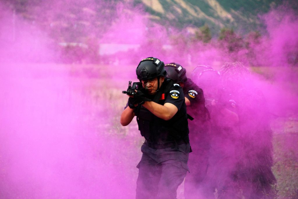 2022年7月21日,甘肃平凉,崆峒分局特巡警大队的队员们正在开展解救人质事件实战处置演练。