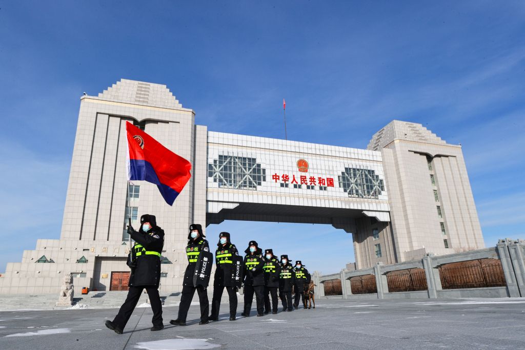 2022年1月7日,呼伦贝尔,国门下民警擎警旗巡逻。卢兵兵 摄
