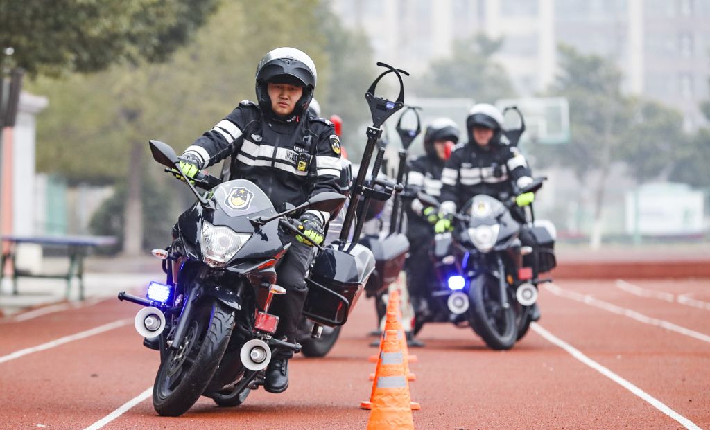 2024年1月3日,江苏省淮安市,巡特警队员在警用摩托车过障碍训练。