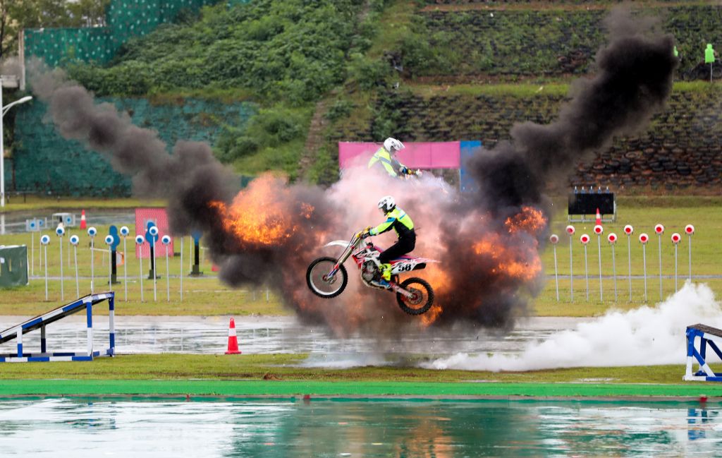 2017年10月12日,武汉。民警们进行车辆特技驾驶汇演。当日,“2017湖北忠诚使命”湖北省公安机关大练兵大比武汇报演练活动在武汉举行。共进行了警察礼仪、战术枪操、车辆特技驾驶、警组红蓝对抗战术射击、公安科技应用助力案件处置等科目的综合演练。共有2600多名公安民警参加此次现场汇报演练,是湖北公安史上规模最大、投入警力最多的一次大型综合演练活动。 张畅(湖北分社)/中新社收起