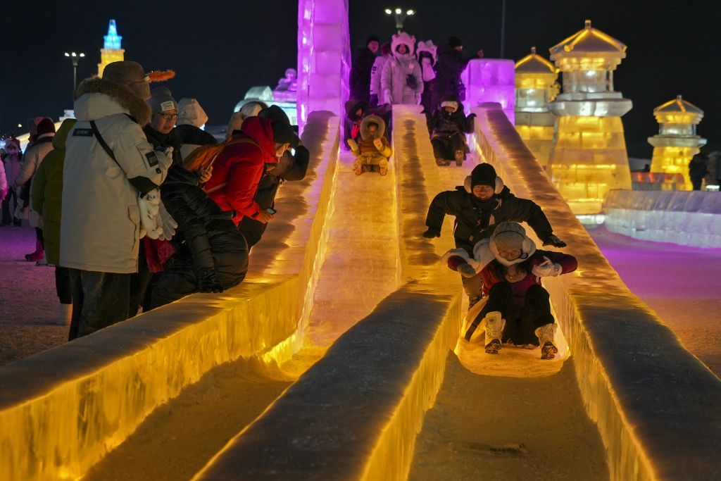 2024年1月8日,哈尔滨,游客在一年一度的哈尔滨冰雪大世界上享受滑冰。