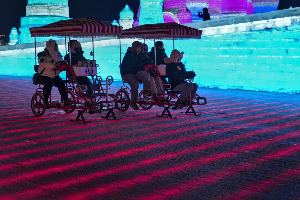 2024年1月8日,游客乘坐租来的小车经过一年一度的哈尔滨冰雪大世界冰雕。