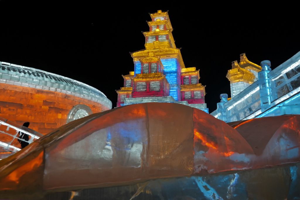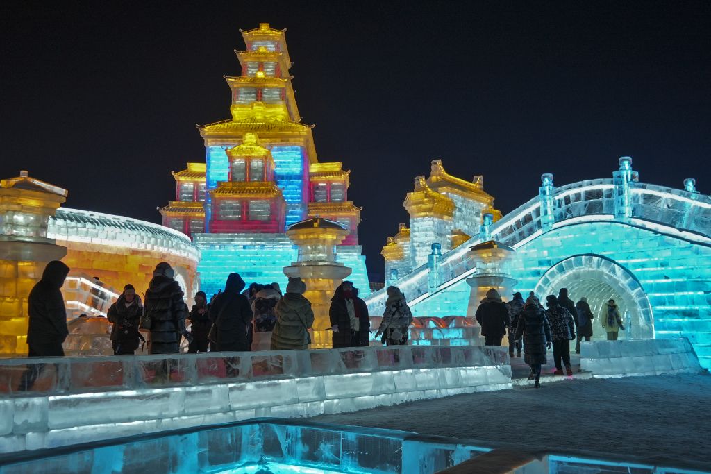 2024年1月8日,游客在一年一度的哈尔滨冰雪大世界冰雕中漫步。
