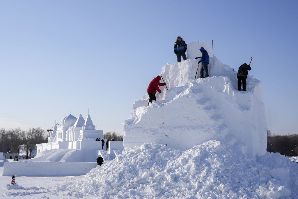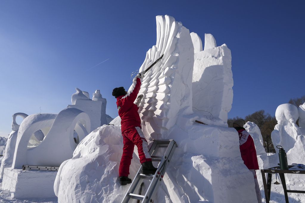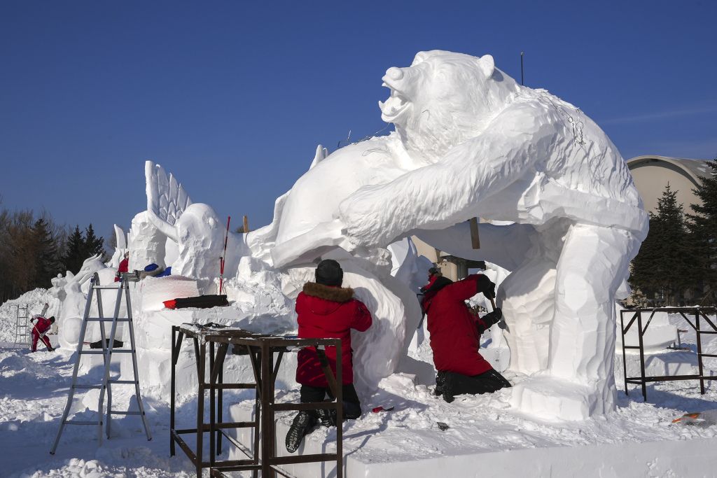 2024年1月8日,哈尔滨,工人们在一年一度的哈尔滨冰雪大世界上雕刻雪雕。