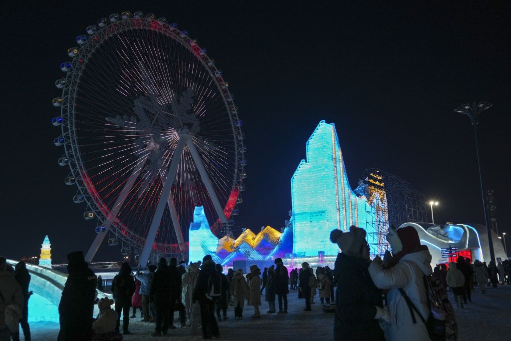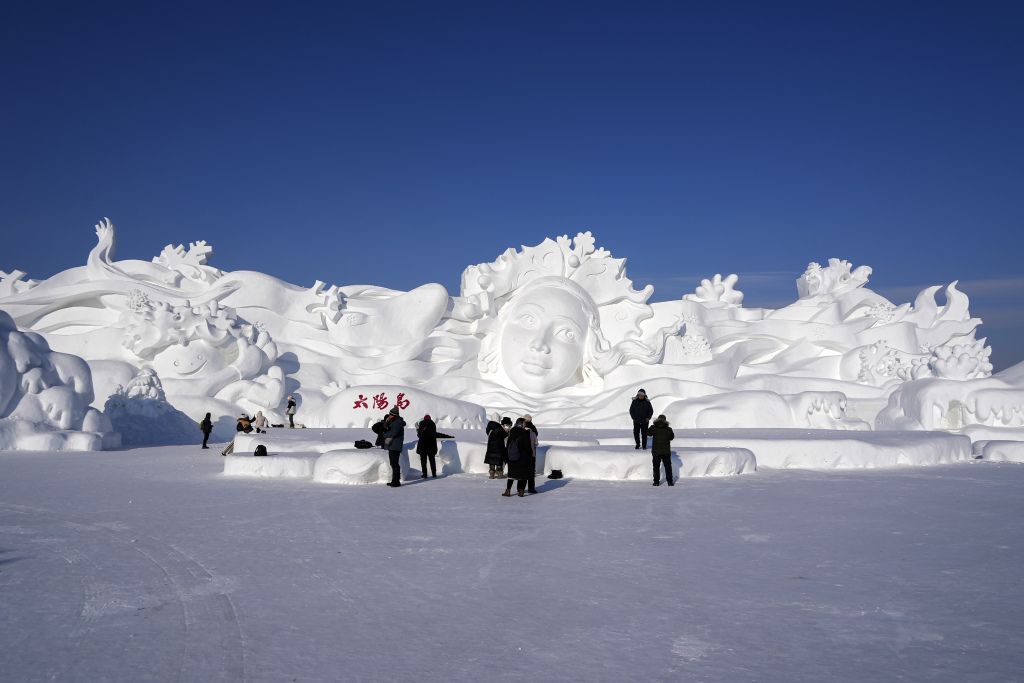 2024年1月8日,游客在一年一度的哈尔滨冰雪大世界观看巨大的雪雕。
