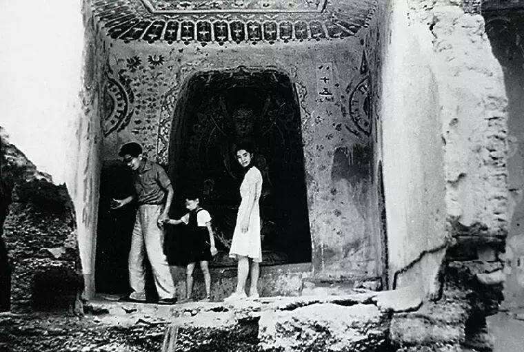常书鸿带着自己两个孩子(沙娜和嘉陵)在莫高窟洞窟内