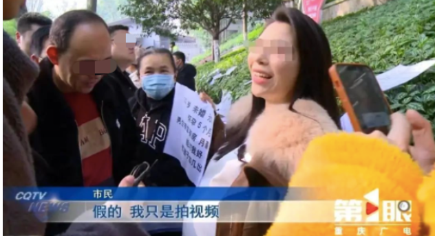 非常巧合的是,当“陈四岁”在向其他市民“卖惨”自己身世时,恰好被重庆电视台一档民生栏目的记者发现。“陈四岁”对着媒体的镜头,倒说起了老实话,承认自己不是真征婚,只是在“拍视频”,除了年龄信息是真的以外,其他信息全是假的,“孕肚”也是由一个球来替代的。