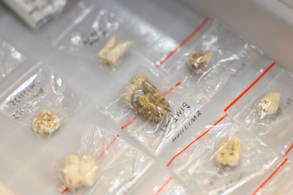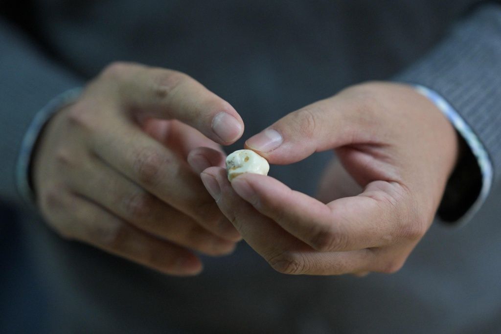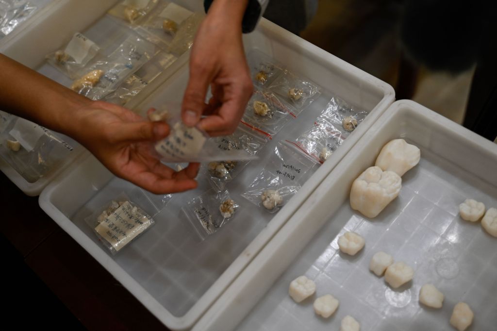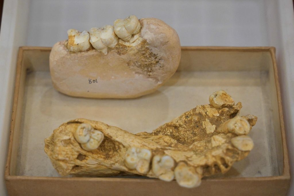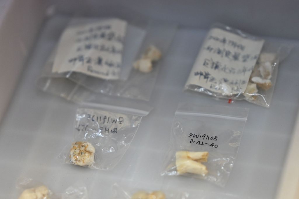 2024年1月10日,北京,中国科学院古脊椎动物与古人类研究所学术会议上,中国学者、联合主任张颖奇在办公室展示了“巨猿灭绝”科学项目的化石残骸。