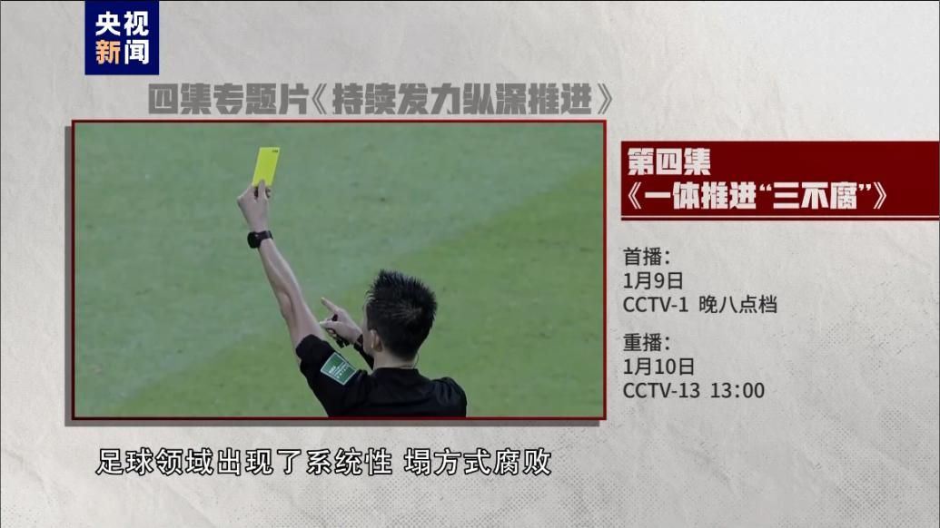 1月9日,由中央纪委国家监委宣传部与中央广播电视总台联合摄制的年度反腐大片《持续发力 纵深推进》播出第四集《一体推进“三不腐”》,揭露足球领域系统性、塌方式腐败。