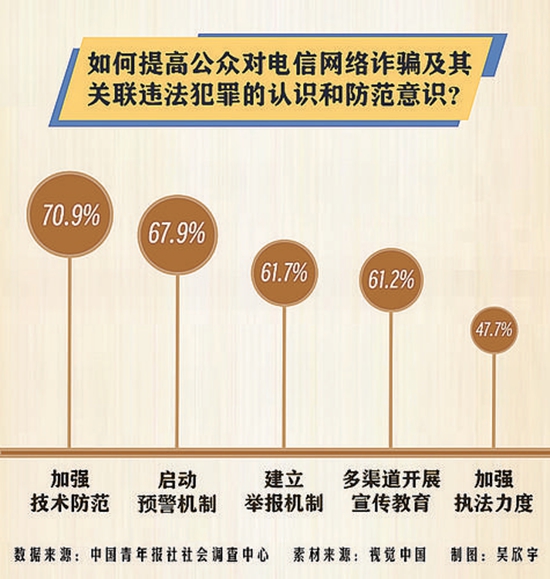 数据显示,为提高公众对电信网络诈骗及其关联违法犯罪的认识和防范意识,70.9%的受访者认为应“加强技术防范”,67.9%表示应该“启动预警机制”,61.7%建议“建立举报机制”,还有受访者表示要“多渠道开展宣传教育”(61.2%)、“加强执法力度”(47.7%)等。